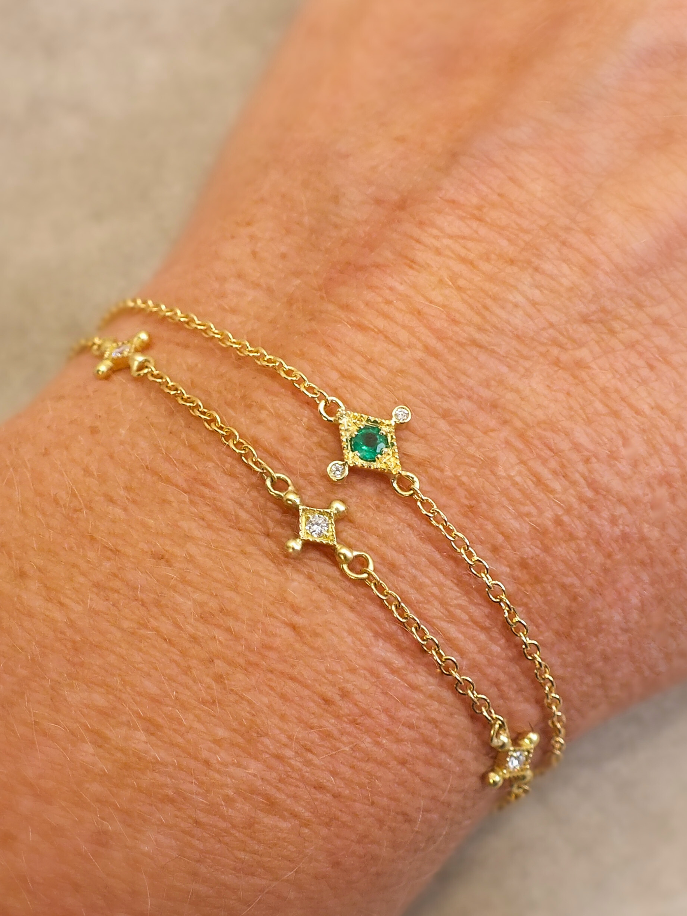 A dainty constellation to wear every day — the Temple of the Stars bracelet is a delicate homage to the quiet brilliance of the night sky. Handcrafted in solid 18k yellow gold, it features five diamond-studded stars, each one a tiny beacon of light and balance.